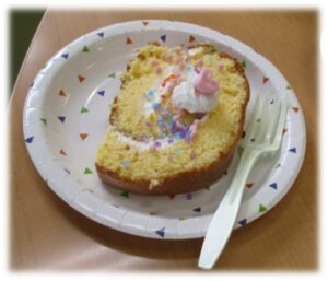 この日は調理実習を行いました。カットしたロールケーキにフルーツやクリーム、チョコレートなど自分の好きな材料で飾りつけをして、オリジナルのケーキを作りました。出来上がったケーキは飲み物と一緒にいただきました。
